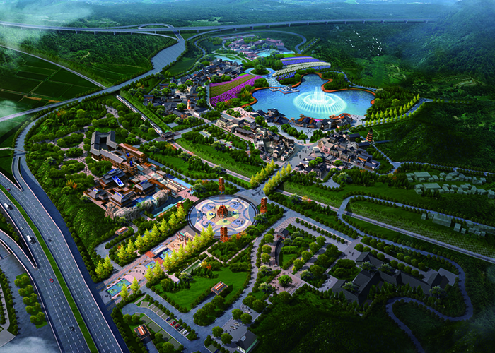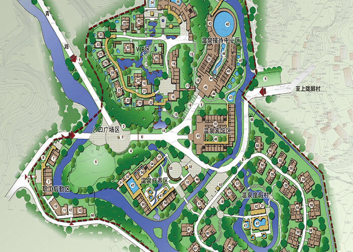 一條景觀主軸是通過大門區(qū)圓形廣場連系西端橋梁與東端溫泉賓館,并延伸至上部隴腳村,形成主要景觀游賞大道。二個溫泉旅游片區(qū);即北部公共溫泉接待片區(qū)、南部溫泉度假、療養(yǎng)片區(qū)。三塊自然臺地為北部鍋底箐峽谷河灘型臺地、南部田園風光臺地、西北部山脊丘陵臺地。八個功能分區(qū)分別為入口廣場區(qū)、溫泉賓館區(qū)、溫泉接待中心區(qū)、公共溫泉區(qū)、VIP區(qū)、溫泉療養(yǎng)區(qū)、溫泉度假區(qū)、職工后勤區(qū)。