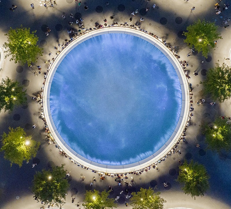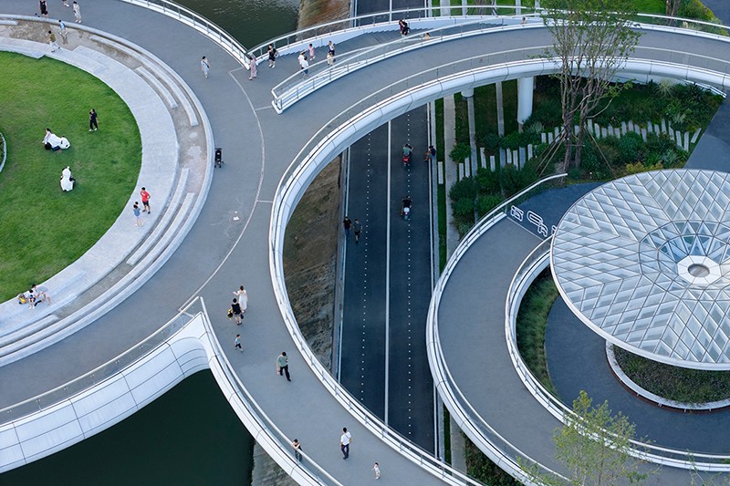值得一提的是,橋上的 9 個(gè)圓盤單元雖大小各異,面積從 300 至 1600 平方米不等,但皆為同形異構(gòu)。圓盤之上精心栽種喬木,使之與河岸綠地綿延相連,仿若一座漂浮于錦江之上的空中公園。這 9 個(gè)圓盤單元既相互關(guān)聯(lián),構(gòu)成一個(gè)完整的景觀整體,又各自獨(dú)立,分化出 9 處風(fēng)格迥異、功能多樣的活動(dòng)空間,全方位滿足市民休閑、娛樂(lè)、社交等多元需求。