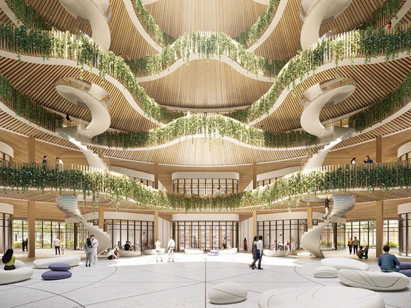 建筑師設(shè)計(jì)了一系列結(jié)構(gòu),如 K 號(hào)樓、維奇奧橋、垂直森林和醫(yī)療標(biāo)志桿,這標(biāo)志著傳統(tǒng)的醫(yī)院設(shè)計(jì)將轉(zhuǎn)向更具綜合性和環(huán)保意識(shí)的方法。K 號(hào)樓與蒂沃利醫(yī)院的三足鼎立核心相連,目前正在施工中。維奇奧橋就像一座有人居住的橋梁,連接著餐廳、會(huì)議室、行政辦公室等各種醫(yī)務(wù)人員設(shè)施以及一個(gè)露天劇場(chǎng)。它橫跨馬克斯-布塞特大道,直接連接 K 樓和新龍?zhí)夺t(yī)院,其螺旋形建筑充滿活力,象征著醫(yī)院的合作關(guān)系。垂直森林體現(xiàn)了新龍?zhí)贯t(yī)院的特色,在一座中層建筑中設(shè)有 600 間客房,占地面積 66 500 平方米。其柔和的曲線營(yíng)造出一種親生物的氛圍,促進(jìn)健康和寧?kù)o。環(huán)形基座圍繞大型天井、中庭和花園設(shè)置了技術(shù)平臺(tái)。