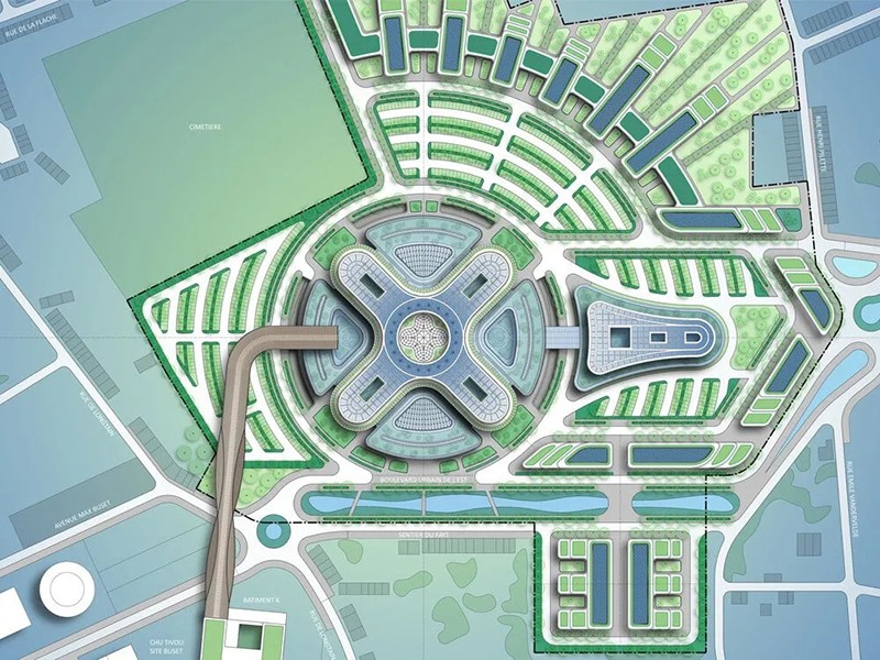 醫(yī)療后勤基地滿足了拉盧維耶爾基地和其他網(wǎng)絡(luò)地點(diǎn)的后勤需求。它位于東區(qū)烏爾班大道北側(cè)的環(huán)島上,提供直接的道路交通,并通過(guò)玻璃天橋與龍?zhí)贯t(yī)院相連。園區(qū)在總體規(guī)劃中整合了代際住房、養(yǎng)老院和娛樂(lè)設(shè)施等互補(bǔ)功能,促進(jìn)了城市的多樣性和一體化。