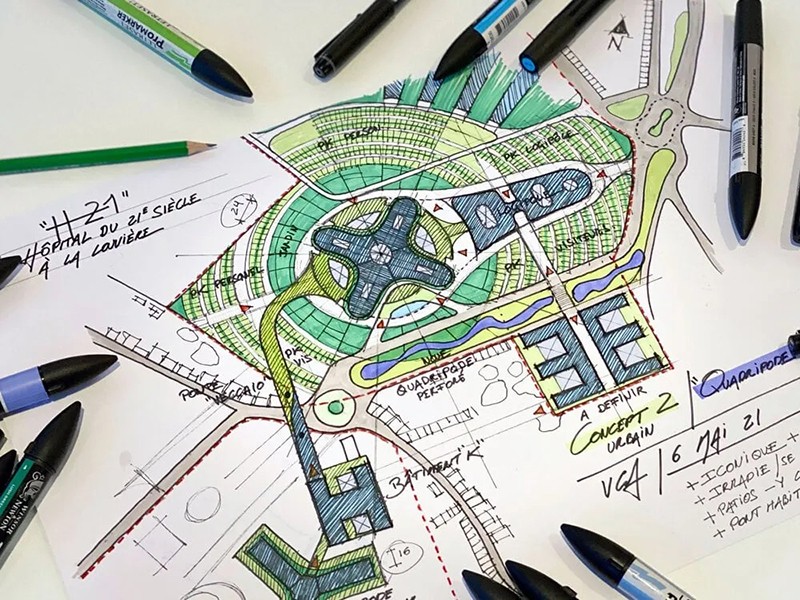 綠色基礎(chǔ)設(shè)施和可持續(xù)解決方案HOSPIWOOD 的目標(biāo)是打造一個(gè)真正的生態(tài)社區(qū),讓居民在這里享受生活、工作和就醫(yī)的樂(lè)趣。該項(xiàng)目注重資源和流量的高效、平衡管理,在保護(hù)環(huán)境的同時(shí)最大限度地利用場(chǎng)地資產(chǎn)。該項(xiàng)目融合了生態(tài)和團(tuán)結(jié)過(guò)渡的元素,如城市綠化、可再生能源利用和可持續(xù)交通??傮w規(guī)劃采用放射狀同心布局,將人流引向中央中庭,將其作為城市公共樞紐。建筑與景觀和諧地融為一體,融入了風(fēng)力渦輪機(jī)和重新利用的礦渣等特色元素。保護(hù)景觀包括將龍?zhí)兜貕K改造成郁郁蔥蔥的城市森林,以防止土壤人工化。這包括種植當(dāng)?shù)靥赜械臉?shù)木,促進(jìn)本地生物多樣性,以及實(shí)施雨水收集系統(tǒng)。新東部城市大道沿線綠樹(shù)成蔭的山谷是一個(gè)顯著特點(diǎn),它是一個(gè)雨水過(guò)濾池,為居民提供了一個(gè)寧?kù)o的環(huán)境。這種綜合方法尊重了該地區(qū)的工業(yè)、文化和自然遺產(chǎn),豐富了社區(qū)的特征。