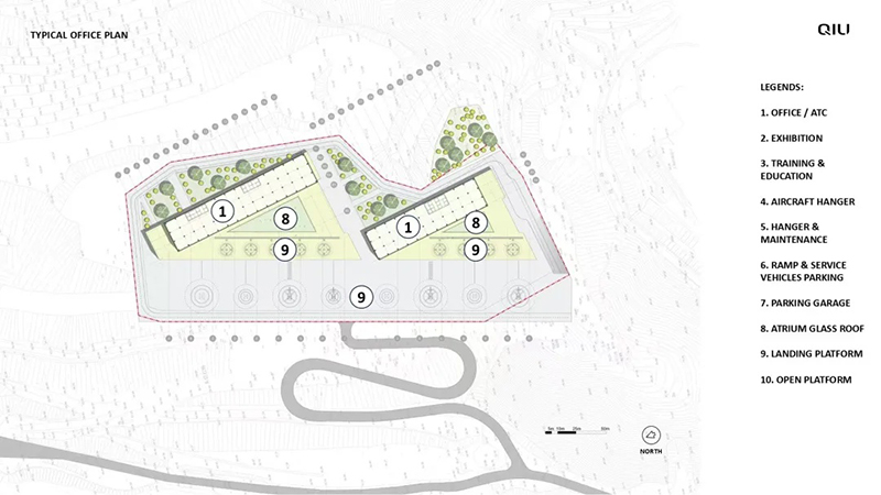 深圳作為全球頂尖科技城市,此無(wú)人機(jī)港位于深圳西北部,地形得天獨(dú)厚,座落陡峭山巔,大海和獨(dú)特的鹽田港在基地一覽無(wú)遺。此直升機(jī)兼載人無(wú)人機(jī)港占地 80,000 平方米,包括寬敞的機(jī)庫(kù)空間、長(zhǎng)達(dá) 2,000 米的室外停機(jī)坪跑道、飛行控制中心、乘客休息室及住宿客房、研發(fā)辦公空間、飛行員培訓(xùn)中心、無(wú)人機(jī)博物館及 VIP 天空會(huì)所等機(jī)能一應(yīng)俱全。eVTOL 場(chǎng)地標(biāo)識(shí)設(shè)計(jì) ? QIUQuality Innovation United (QIU):