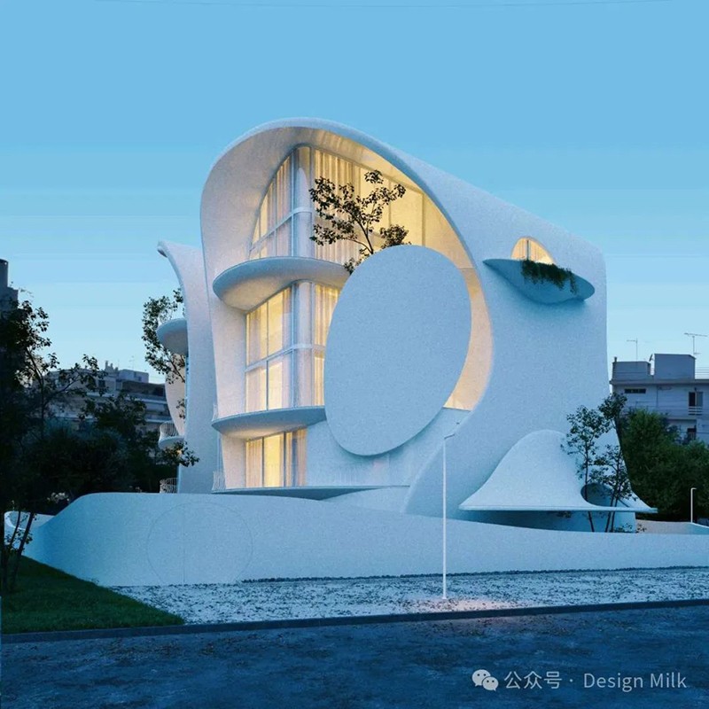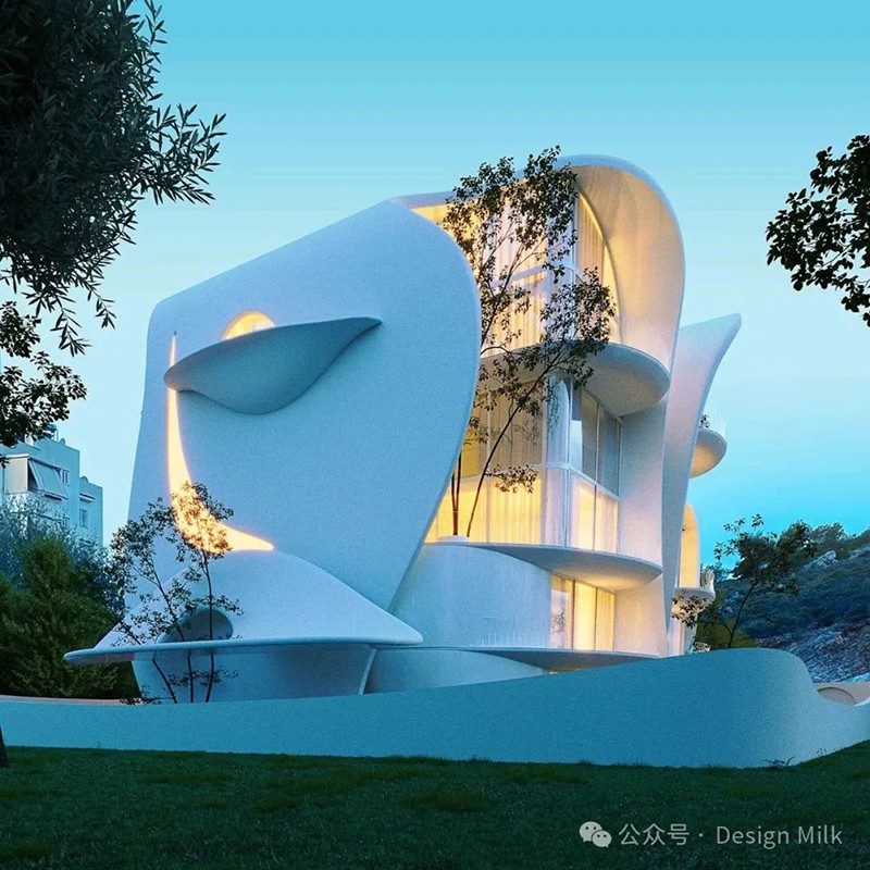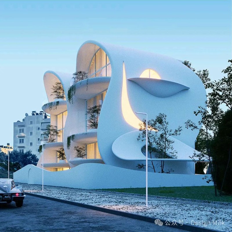 外表面光滑、潔白,加上精心布置的燈光,凸顯了建筑復(fù)雜的輪廓。 設(shè)計(jì)中融入了大型圓形開(kāi)口和彎曲的陽(yáng)臺(tái),可以看到室內(nèi)景象,并提供與外部無(wú)縫融合的室外空間。 這些陽(yáng)臺(tái)上裝飾著綠色植物,不僅增添了一絲自然氣息,也增強(qiáng)了建筑的有機(jī)美感。 整體效果既具有未來(lái)感又不失自然,營(yíng)造出強(qiáng)烈的視覺(jué)沖擊。
